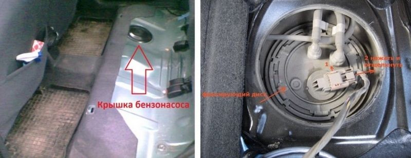 Снимите задний диван, он крепится на двух защелках к полу. Далее демонтируйте пластиковую крышку и под ней отсоедините разъем питания на бензонасос.