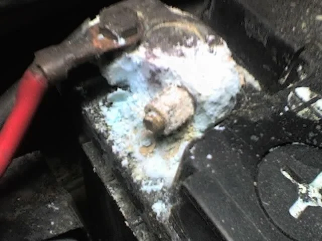 То же самое бывает в случае когда плохо следят за аккумуляторной батареей, на клеммах образуются окислы, (обычно они сине-зелёного цвета или белесого).