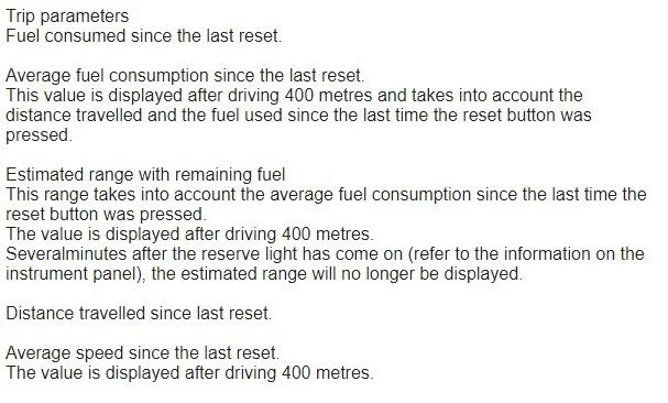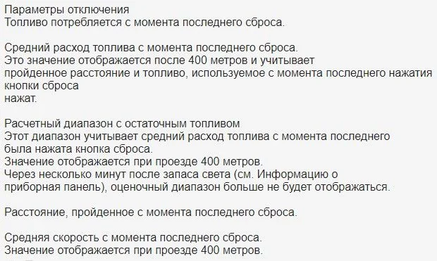 Это данные бортового компьютера по расходу топлива, пробегу на данном топливе, выдержка из руководства ниже (значения можно переключать при помощи подрулевого переключателя)