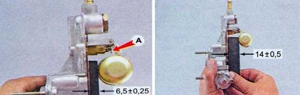 Расположить крышку карбюратора в горизонтальном положении вниз поплавком. Измерить зазор между поплавком и прокладкой карбюратора. Зазор должен составлять 12,5 мм. Ход поплавка должен составлять 8 мм. Расстояние от прокладки до нижнего края поплавка не должно быть больше расстояния глубины поплавковой камеры. Поплавок не должен касаться дна поплавковой камеры. Регулировка хода поплавка осуществляется двумя его упорами путем их подгиба