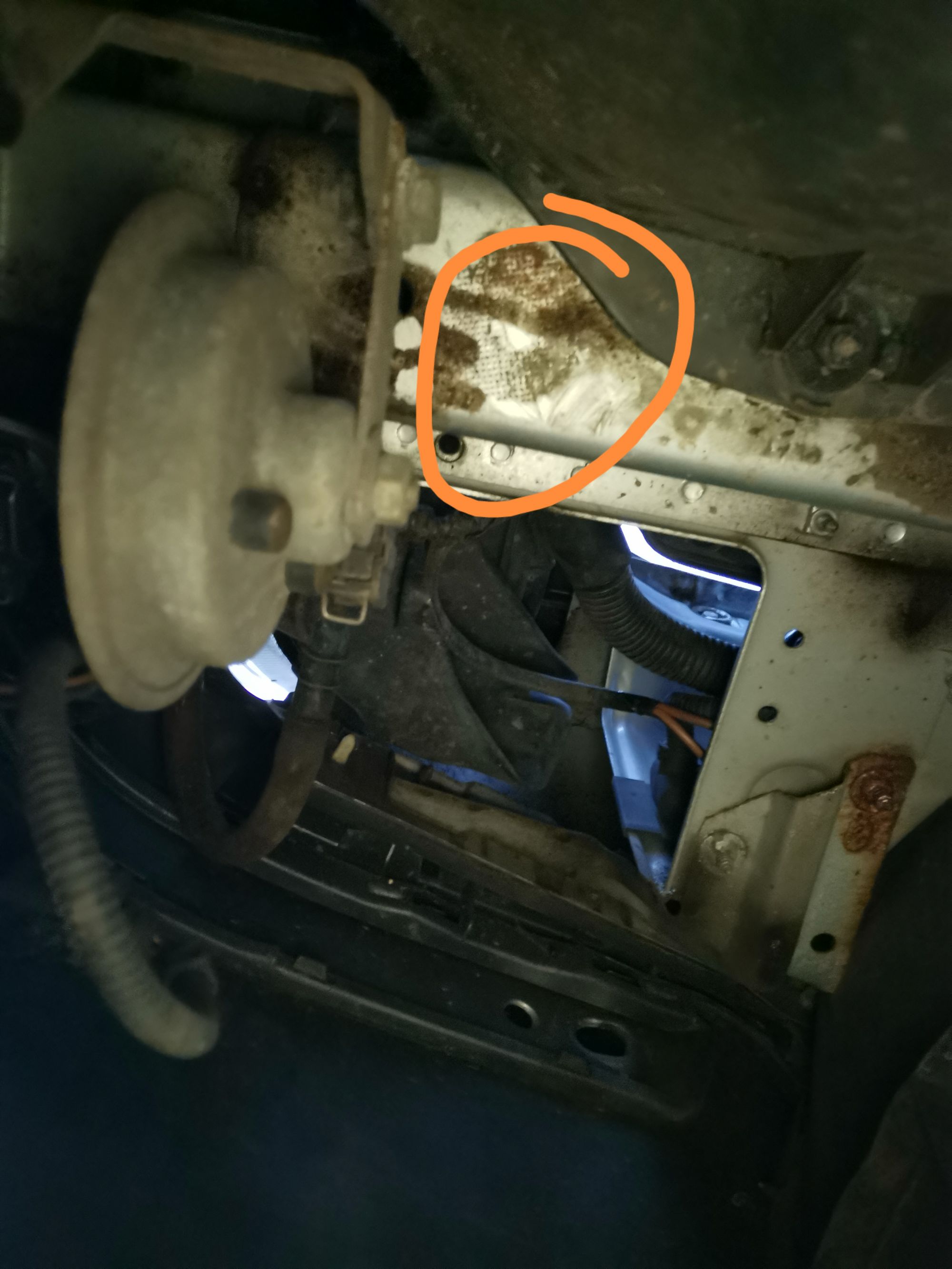 Просто это грубо говоря средина лонжерона, вроде бы его не резали, как тогда туда запихнули этот зажим, и разве они круглые бывают? Да еще и форма следа, не сплошной след а еще и посредине пустота.