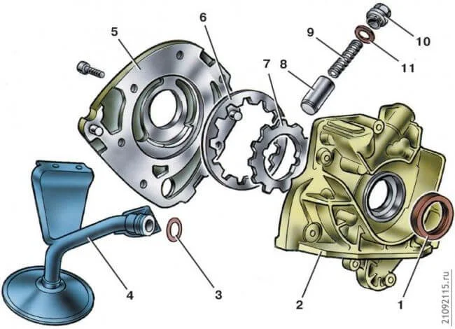 Ильмир, залейте насос перед установкой маслом. Возможно он просто гоняет воздух по кругу, не в состоянии поднять масло из картера. Второе — насос может качать опять-таки воздух. Потому что есть дыра в маслозаборнике. Например отсутствует, или уже изношено, уплотнительное кольцо. На рисунке его номер 3.