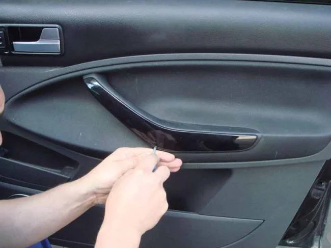За декоративной панелью ручки двери два болта. Вот видео фокуса, тоже самое. Только там уже открутил два болта ручки, то что на фото.