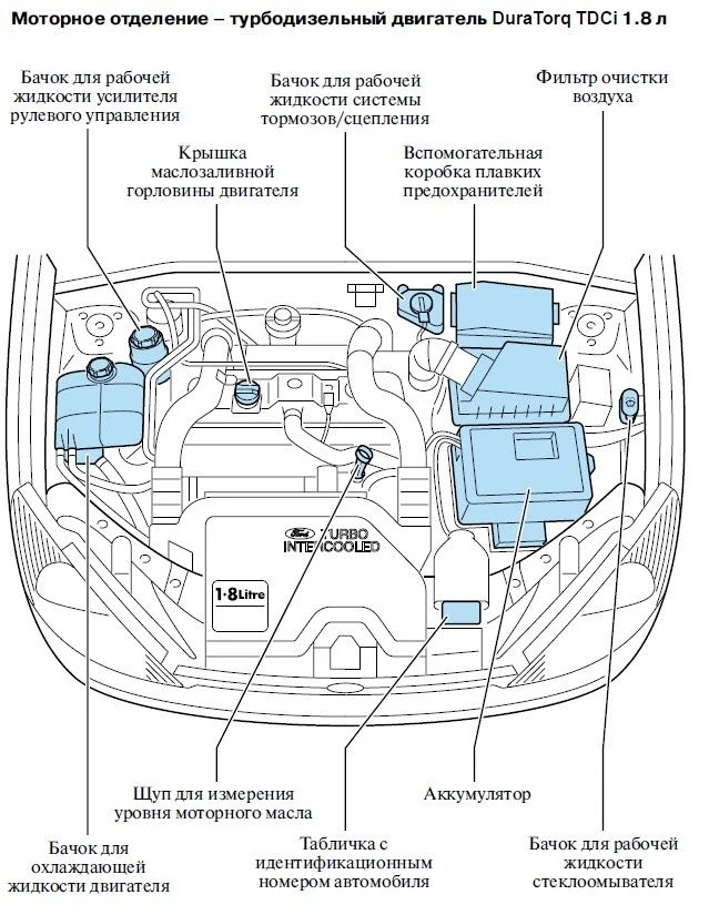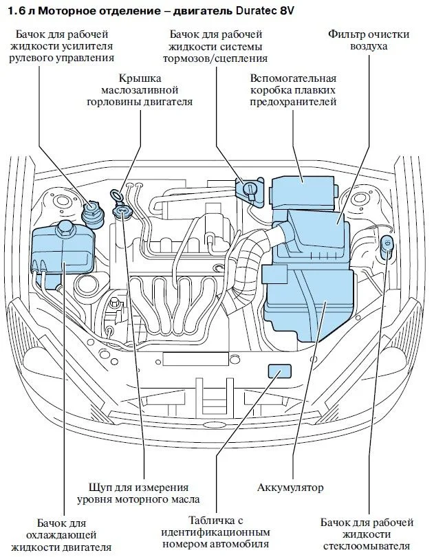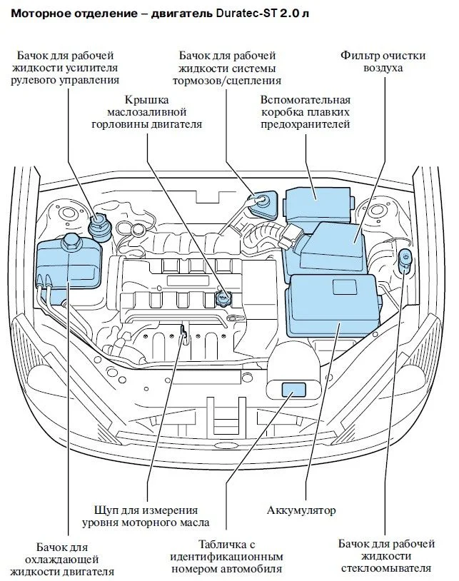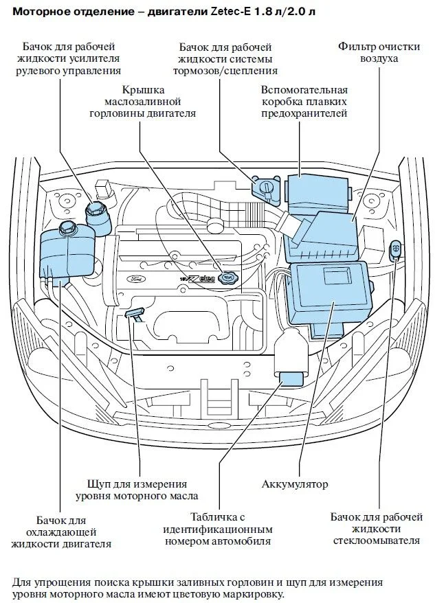 Описание капота Форд Фокус, седан, 2001 г. выпуска. Нет книжки иллюстрации описания двигателя, где, какой бачок и куда, что заливать?