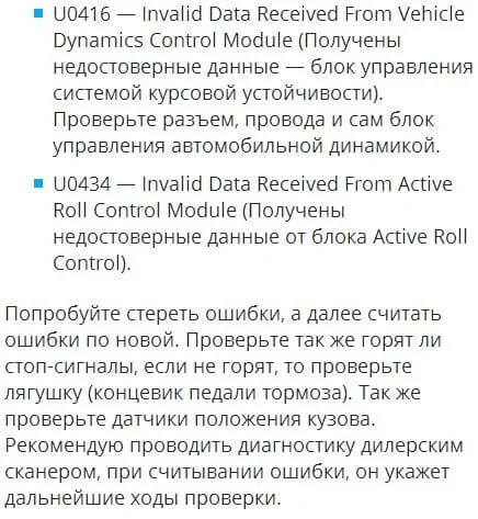 Опустился перед и не хочет подыматься. По сканеру ошибки u0416, u0434. В дате когда машина опущена полностью, показывает, что передняя левая стойка поднята. Если на заведённую машину поднять домкратом левую переднюю сторону за кузов, то передняя правая стойка накачивается. Подскажите причину.