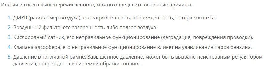 Здравствуйте. Недавно появилась ошибка P0172 богатая смесь. Чем это сопровождалось. Поначалу на первой скорости у меня машина почти глохла на несколько секунд, а потом набирала обороты, потом эта проблема пропала. Когда машина постоит пол дня, день, я сажусь начинаю заводить машину, она либо заводится и глохнет либо крутит стартер и не заводится. Со второй попытки всегда заводится. Но это тоже не постоянно происходит.