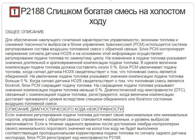 P2188 — Богатая смесь на холостом ходу, подробное описание и возможные причины описаны ниже. Не стоит без проверки датчика кислорода его менять.