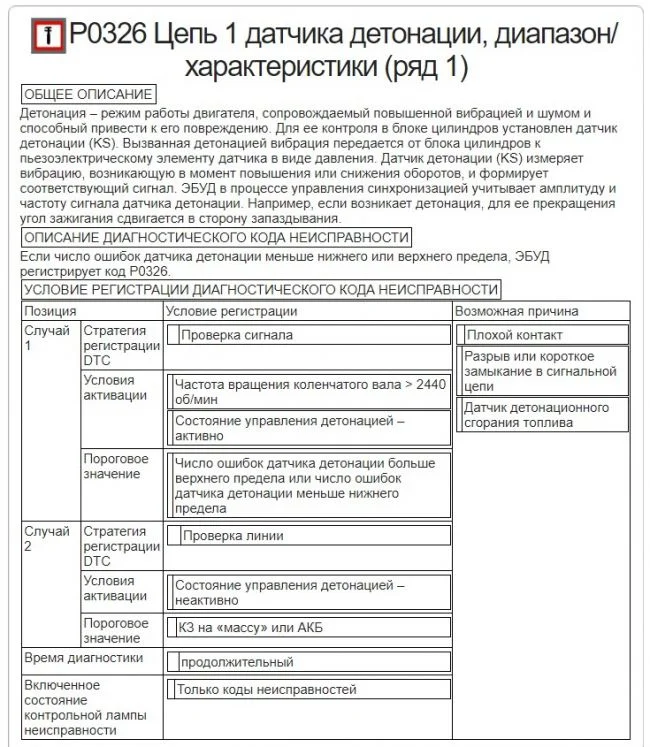 P0326 — Цепь 1 датчика детонации — диапазон/характеристики. Возможные причины описаны ниже.