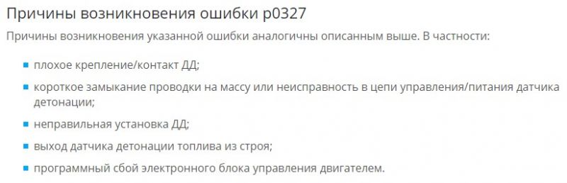 Р0327 Датчик детонации 1, банк 1 — низкий уровень сигнала.