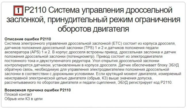 Подробно по ошибке ниже описано и возможные причины. Из за дроссельной заслонки и обороты могут плавать, проверьте разъем и провода дроссельной заслонки, попробуйте ее почистить.