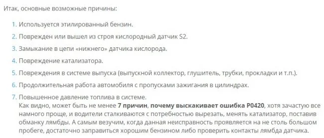 P0420 — Каталитический нейтрализатор, банк 1 — эффективность ниже требуемой. Для проверки катализатора можно проверить его противодавление. Подробнее о данной ошибке описано тут.
