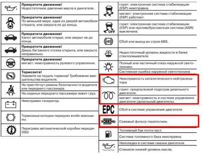 Это не ошибки, это значки, ошибки сканером считываются) Нужно провести диагностику сканером, считать ошибки и провести по ним ряд проверок. Вероятнее всего нужно провести принудительную регенерацию сажевого фильтра при помощи диагностического сканера, есть информация тут, но поколение не указано.