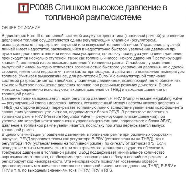P0088 — Давление в системе / в топливном коллекторе – слишком высокое. Проверьте фактическое давление топлива.