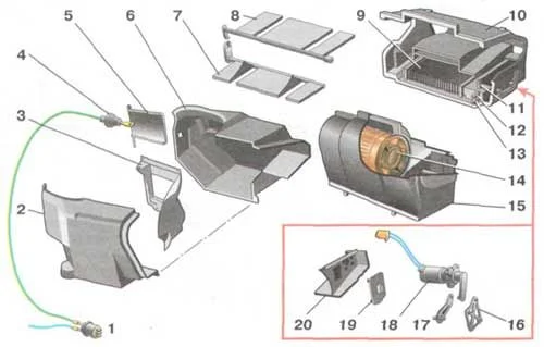 Детали отопителя (ВАЗ 2110 2111 2112): 1 — электропневматический клапан; 2 — передний корпус воздухозаборника отопителя; 3 — водоотражательный щиток воздухозаборника; 4 — клапан управления заслонкой рециркуляции; 5 — заслонка рециркуляции воздухозаборника; 6 — задний корпус воздухозаборника отопителя; 7 — заслонка канала отопителя; 8 — заслонка управления отопителем; 9 — радиатор; 10 — кожух радиатора отопителя; 11 — штуцер пароотводящего шланга; 12 — штуцер подводящего шланга; 13 — штуцер отводящего шланга; 14 — электродвигатель отопителя с вентилятором; 15 — корпус электродвигателя; 16 — опорная площадка рычага привода заслонки управления отопителем; 17- рычаг привода заслонки управления отопителем; 18 — микромоторедуктор привода заслонки; 19 — резистор; 20 — крышка кожуха отопителя.