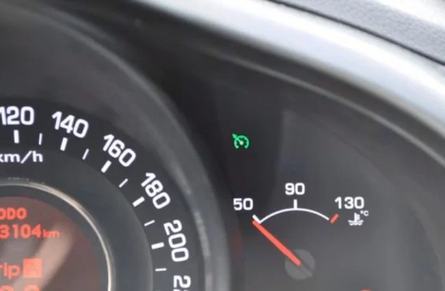 Это система круиз контроля, значит она не исправна (если круиз контроль исправен, значок загорается зеленым светом), нужно провести диагностику сканером, считать ошибки и проверить по ним ряд проверок. Диагностику желательно проводить оригинальным сканером. Так же проверьте горят ли стоп сигналы при нажатии педали тормоза.