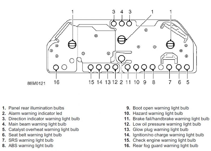 Есть значок с автомобилем, это открытый багажник. Ниже приложил описание значков (на английском), уточните номер значка. Если такой значок, то проверьте проводку в гофре между кузовом и дверью багажника.
