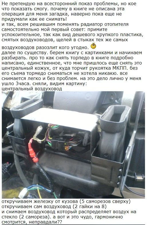 Подскажите, как разобрать панель на «Соланчике», что-бы добраться до печки, заслонкам, и тому подобное, печка мудрит, может видео, фото инструкции по разбору.