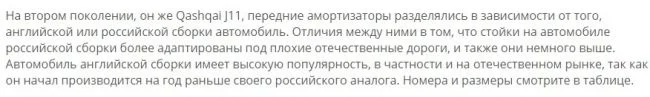 Автор там дает размеры стоек английской сборки для Кашкая J11:-высота корпуса без учета штока-327 мм, ход штока-149 мм. Но он не уточнил, что это стойки чисто для Европы, там клиренс у Кашкая 17см. Для России же в Сандерленде они сразу ставили другие стойки: высота корпуса без учета штока -383 мм, ход штока 182 мм, в чем я сегодня и убедился, поменяв заводские убитые стойки.