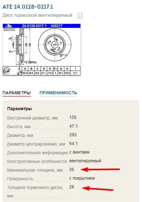 Толщина тормозного диска передних колёс при предельном износе — 26,00 мм