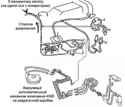 Под колесную арку уходит магистраль на соленоид включения полного привода. При управлении с кнопки 4WD происходит перенаправление вакуума с одной диафрагмы на другую вакуумного исполнительного механизма, включающего режим 4WD в раздаточной коробке.