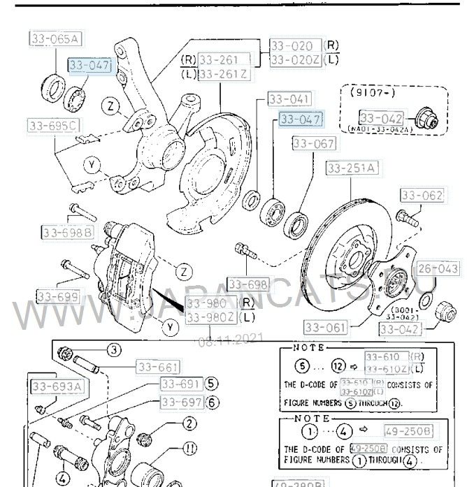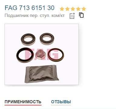 Передний ступичный подшипник, оригинал Mazda B001-33-047, 2 шт. стоит в ступице. Можно взять например аналог FAG 713 6151 30 (комплект).