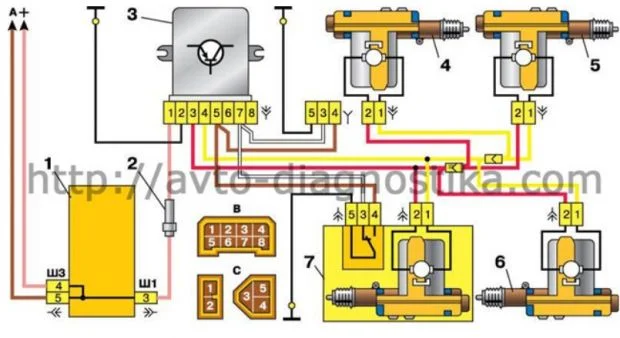 Если он исправен и на колодке(выводы 1, 2) присутствует 12 вольт, нужно проверить сам блок ЦЗ. Для этого в колодке замкните на массу(масса вывод 2 на колодке) вывод 5 и вывод 7(открытие/закрытие). Актуаторы должны сработать. На сигналке тоже есть два предохранителя, висят непосредственно на проводах, рядом с блоком сигнализации, но раз вы ее выдрали то они не в счет.