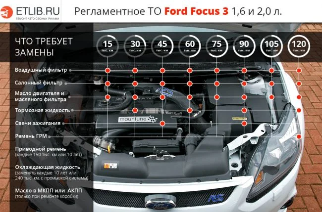Регламент прохождения ТО Фокус 3, подобный этому, безусловно, весьма полезный, но также надо, каждые 15,000 км/пробега, проверять: