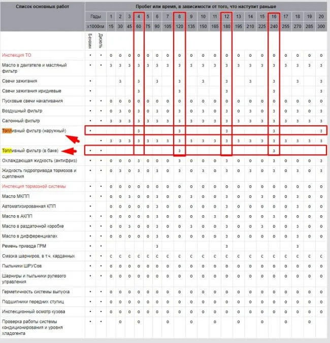 Если же вы ездите по России и заправляетесь на разных АЗС, в том числе и на не проверенных. То сокращайте пробеги по замене фильтров в двое. Если ездите много, то меняйте фильтр перед каждой зимой, чтобы в холода и морозы не было проблем с запуском и работой двигателя.