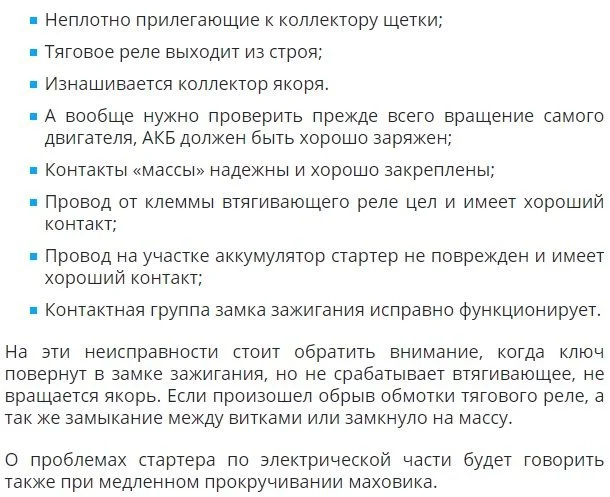Немного из практики. Стартер не проворачивает двигатель. Зарядили аккумулятор — не помогло. Заменили аккумулятор на заведомо исправный — не помогло. Сняли стартер, перебрали — не помогло. Зачем-то начали крутить двигатель руками — не крутится. Почесали репу. Стали готовить двигатель к разборке. Сняли радиатор. Сняли ремень навесных. Зачем-то прокрутили коленвал — крутится! Оказалось что заклинил генератор! И натянутым ремнём клинило коленвал!