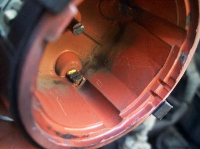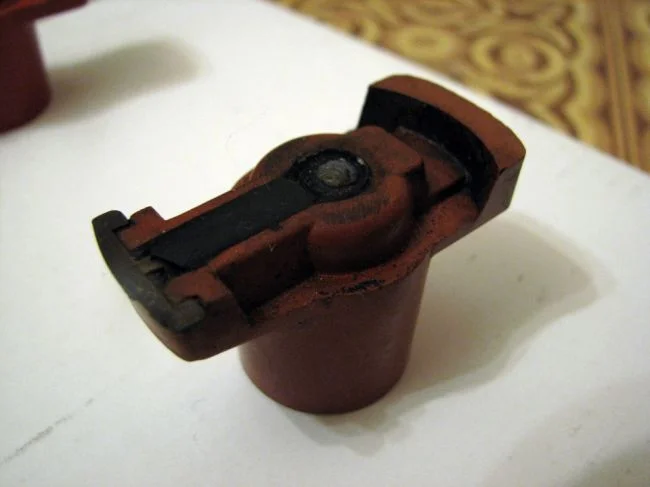 Сначала проверяем самое простое, крышку трамблёра и бегунок. Осматриваем на обгорание контактов и отсутствие трещин в крышке. Также может сгореть резистор в бегунке.