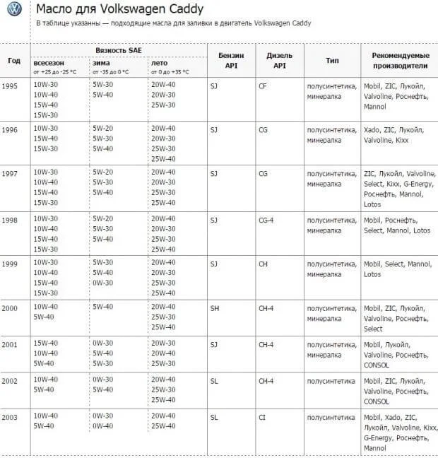 Подбор масла на зиму и лето для Фольксваген Кэдди 2