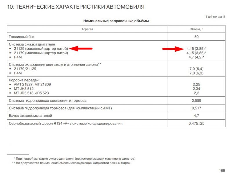 Объем масла моторного