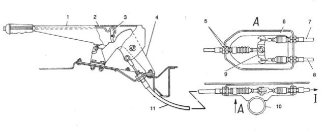 - нужно ослабить гайки (“5” на схеме 1), которые фиксируют трос (“11” на схеме 1) на кронштейне (“6” на схеме 1).