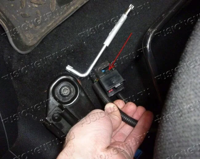 Fusion 1 поколения. Снимаю «торпедо», не могу снять разъем подушки безопасности переднего пассажира. Как он отстёгивается?