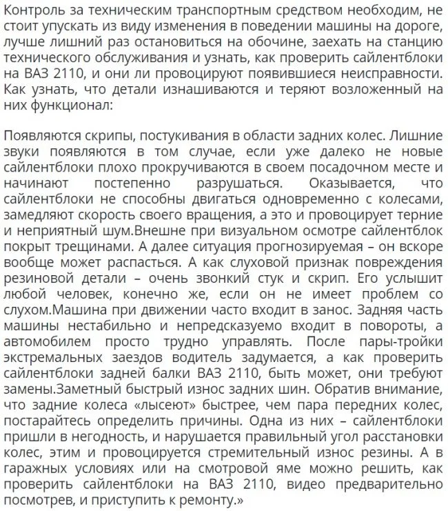 Были бы вы рядом с машиной, я смог бы вам показать. Не зря же я выдал вам выдержку и там написано что первый раз надо увидеть, как это делают люди. Хорошо, попробую написать как это делается: машину на смотровую яму или на эстакаду, берёте в руки ломик , монтажку (не маленькую), и начинаете шевелить те места где установлены сайлен/блоки ,если на реактивной тяге сайлен/блок, то значит шевелим ломиком тягу). БОЛТАНКИ - не должно быть. Если есть зазор между резинкой (сайлен/блоком) и металлом - это износ.
