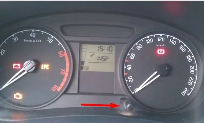 нажать и удерживать кнопку на панели приборов (указана стрелкой)