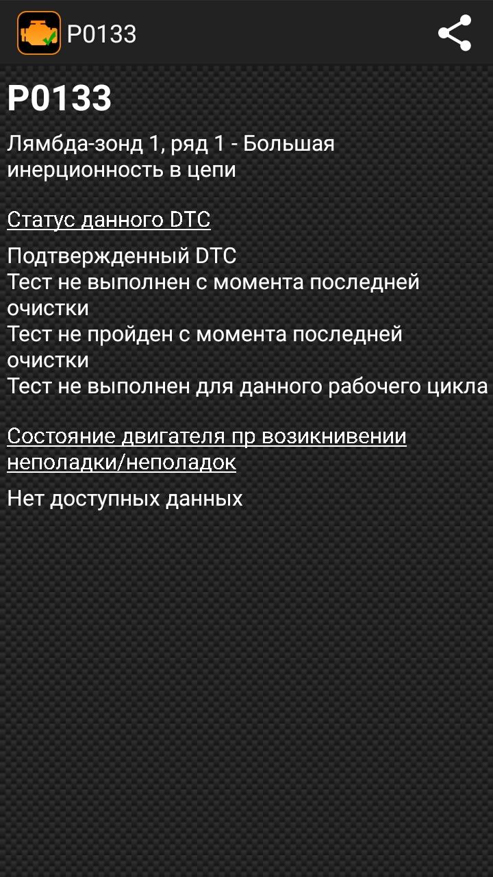 P0133 — Подогреваемый кислородный датчик 1, банк 1 – малое быстродействие. Проблема может быть в самом датчике, в проводке до него. Подробно по ошибке описано по ссылке.