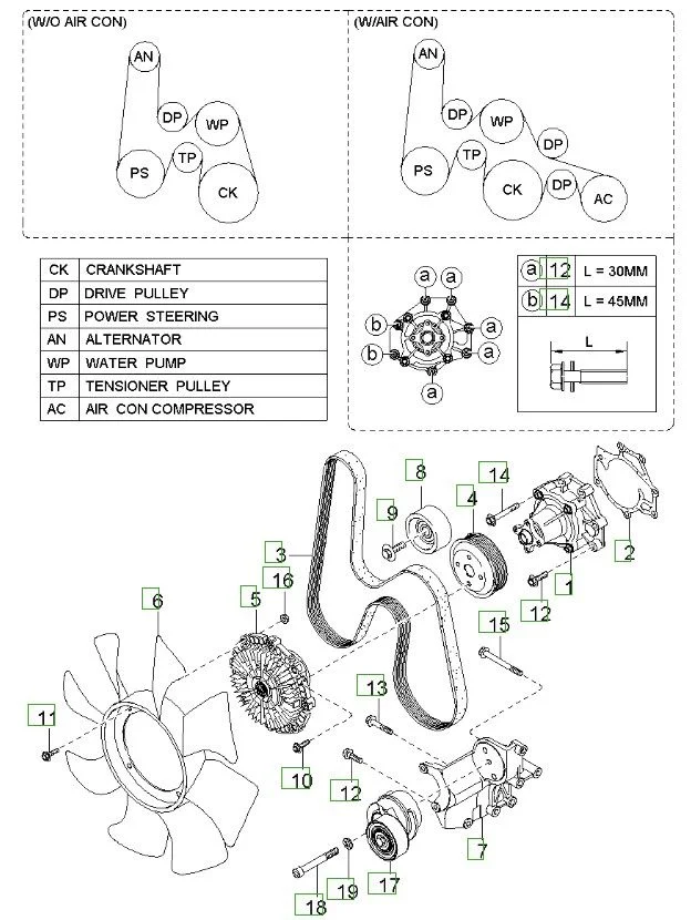 Ролики и подшипники навесного оборудования стоит проверить, ролики можно заменить. Ролик под №8 — оригинал Hyundai / KIA 25286 4A000, можно выбрать из аналогов (например SKF VKM 64012). Под №17 (ролик натяжитель) — можно взять отдельный ролик (например LYNXauto PB-7191), если сам натяжитель (оригинал Hyundai / KIA 25281 4A000) в порядке.