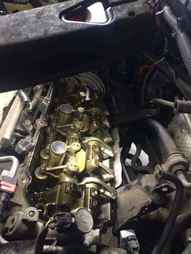 На фото видно, нет регулировочных винтов на коромыслах выпускного вала, там гидрокомпенсаторы. На впускном валу стоят коромысла с регулировочными винтами