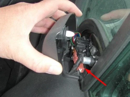 За треугольной обшивкой зеркала есть провод, который уходит за обшивку двери водителя (разъём, видимо, там)