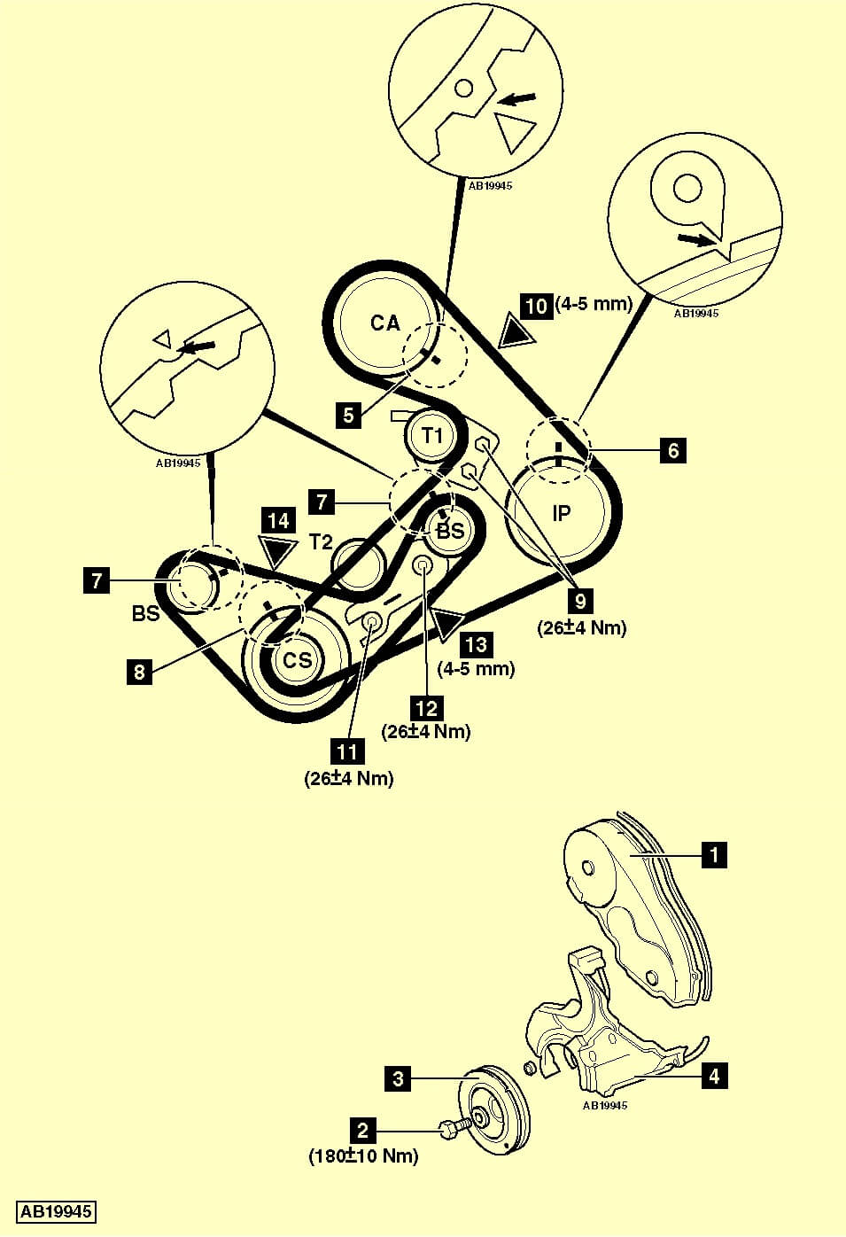 Затянуть верхний болт кронштейна натяжителя (9) моментом 26±4 Нм.Затянуть нижний болт кронштейна натяжителя (9) моментом 26±4 Нм.