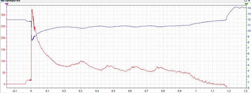 На графике схема потребления тока (амеры красным графиком отмечены) при запуске бензинового двигателя 1.5. Нужно понимать, какой график для вашего стартера. Попробуйте убрать люфт шестерен.