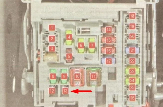 Плавкая вставка под №13, в салоне.