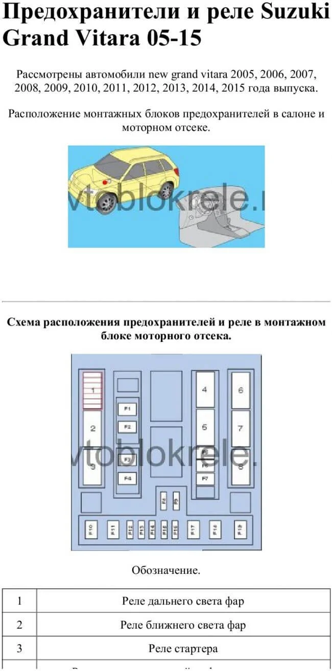 Смотрите предохранители «Suzuki Grand Vitara» на русском языке, и моторном отсеке, и в салоне.
