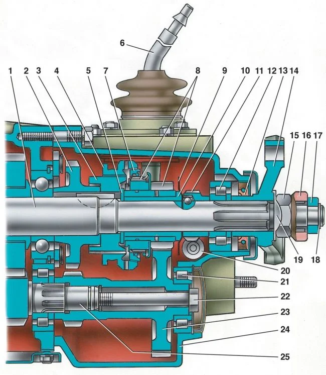 Задняя часть пятиступенчатой коробки передач: 1 — вторичный вал; 2 — ведомая шестерня заднего хода; 3 — ступица муфты синхронизатора V передачи; 4 — муфта синхронизатора; 5 — шайба; 6 — рычаг переключения передач; 7 — блокирующее кольцо синхронизатора; 8 — шестерня и зубчатый венец синхронизатора V передачи; 9 — маслоотражательная шайба; 10 — втулка шестерни V передачи; 11 — ведущая шестерня привода спидометра; 12 — задний подшипник вторичного вала;13 — сальник; 14 — фланец эластичной муфты; 15 — гайка; 16 — уплотнитель центрирующего кольца; 17 — центрирующее кольцо; 18 — стопорное кольцо; 19 — стопорная шайба; 20 — ведомая шестерня привода спидометра; 21 — подшипник блока шестерен; 22 — болт крепления блока шестерен; 23 — блок шестерен V передачи и заднего хода; 24 — задняя крышка коробки передач; 25 —промежуточный вал