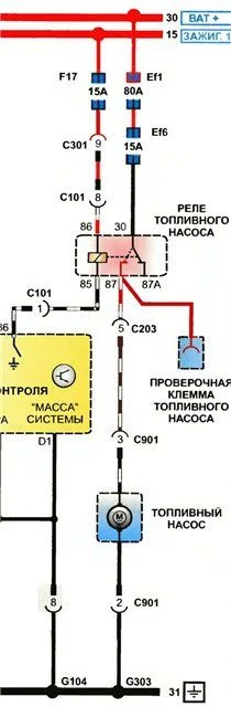 Ну так перетряхивайте проводку от насоса до его реле (реле включается блоком управления (ЭБУ)), у вас явно где-то контакт теряется. На схеме в принципе все указано.