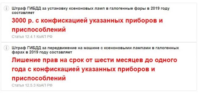 Лишение права управления автомобилем на срок от шести месяцев до года с конфискацией этих ламп. Могут еще и штраф 3000 рублей выписать за их установку. На фаре указан тип ламп, которые можно ставить. С ксеноном еще должен быть омыватель фар и автокорректор фар.