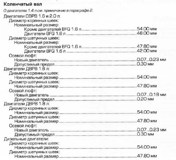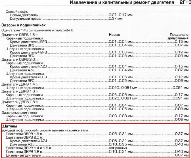 Здравствуйте, подскажите пожалуйста, какой должен быть продольный ход шатунов на коленвале Гольф 4, 1.6, 16V, AUS?
