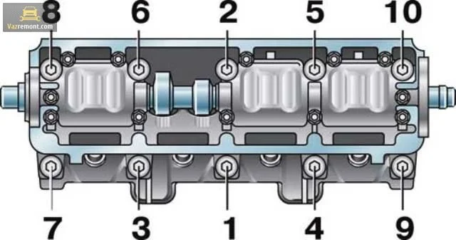 Протяжка болтов ГБЦ происходит в таком порядке: