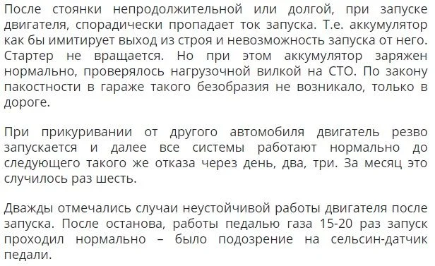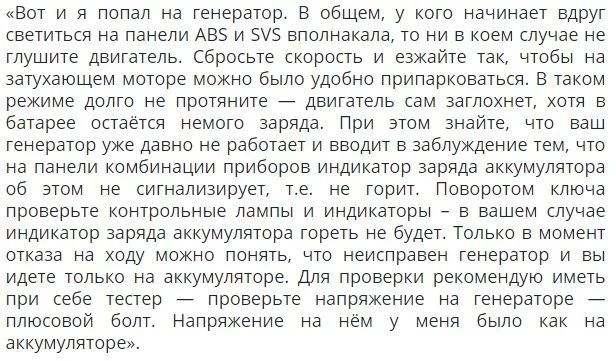 В промежутках между не запусками по типу имитации отказа аккумулятора, в процессе движения автомобиля вдруг начинало падать напряжение в сети (определил по замедленным движениям щёток ветрового стекла, т.е. ехал в дождь), периодически на табло загорались лампы АВS и SVS с постепенным погасанием в течении 3-5 мин. Иногда лампа SVS горела вполнакала постоянно. Всякий раз выскакивал световой сигнал Check и двигатель медленно с перебоями глох. При прикуривании от другого автомобиля двигатель резво запускался и далее все системы работали нормально до следующего такого же отказа. Такое за месяц случилось 3 раза.